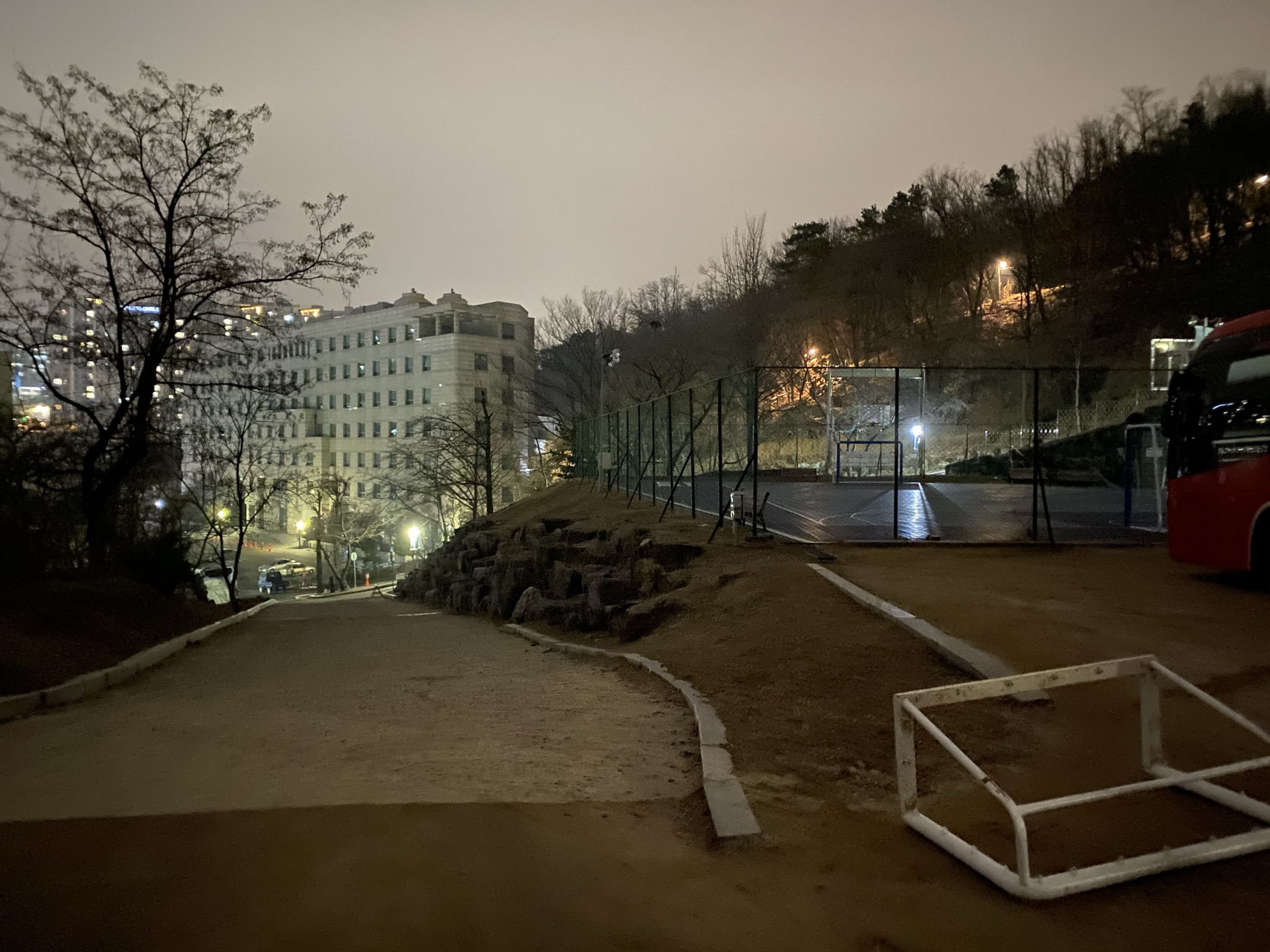 다만 지금 사진 속 저 희미하게 빛나는 가로등 덕분에 그나마 이쪽 벽쪽 골대에서 슛연습하기엔 좋은 거 같다.