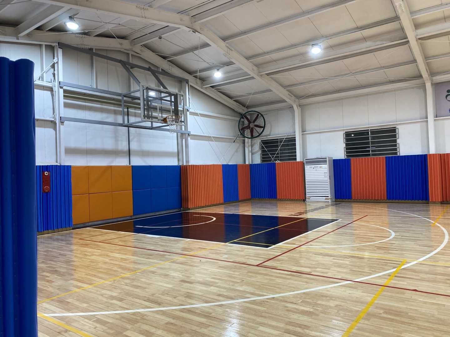 아무래도 어린 아이부터 성인까지 다양하게 체육관을 이용하다보니 벽면에 이렇게 다치지 말라고 쿠션도 쫙 깔아두셨다. 체육관 자체는 다 정규 사이즈보다 짧고 좁은 편이다! 그래도 5:5 풀코트할 만한 사이즈다! 그치만.. 우리는 4:4 풀코트를 했던 거 같다 ㅋㅋㅋ 이건 인원이 없었어서! ㅋㅋㅋ 반대편도 위 사진과 똑같이 생겼다 ㅋㅋㅋ 풀코트 한 번에 나오게는 찍질 못했다. 여기는 코트고, 코트 밖에 의자도 있고 창고도 있어서 공도 있고, 쉴 수도 있고 좋았다.