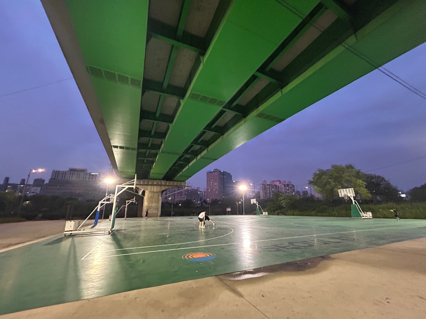 이렇게 다리 아래 있으니 비도 안 맞고, 라이트도 일찍 켜지고. 그리고 생각보다 매우 밝았다. 아 물론 지금 사진 찍은 쪽 골대 말고 안쪽 골대 4개 있는 곳이. 골대가 총 6개다. 이렇게 사진 찍은 쪽에서 보이는 2개의 바깥(?) 골대랑 공 나가지 말라고 철조망해 둔 안쪽 골대 4개랑. 그치만 골대는 많아도 3점 라인이라던지 자유투라인이 제대로 안 돼 있어서 풀코트는 어렵고 반코트 게임하거나 연습하기 좋아 보였다.