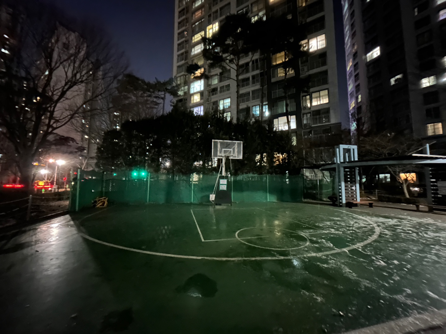 바닥도 우레탄이라 좋다. 진짜 아파트 농구장 중에 우레탄으로 안 하고 이상한 바닥하는 곳들 많은데 그러면 대체 농구를 하란건지 말란건지. 인테리어하시는 분이 농구에 전혀 문외한인 게 분명... 그치만 여기는 바닥부터 우레탄! 합격!! 근데 골대에 그물 없는 건 아쉽 ㅠㅠ 사진이 야간모드로 찍혀서 꽤 밝게 나왔는데, 실제론 조명이 이것보다 희미하다.