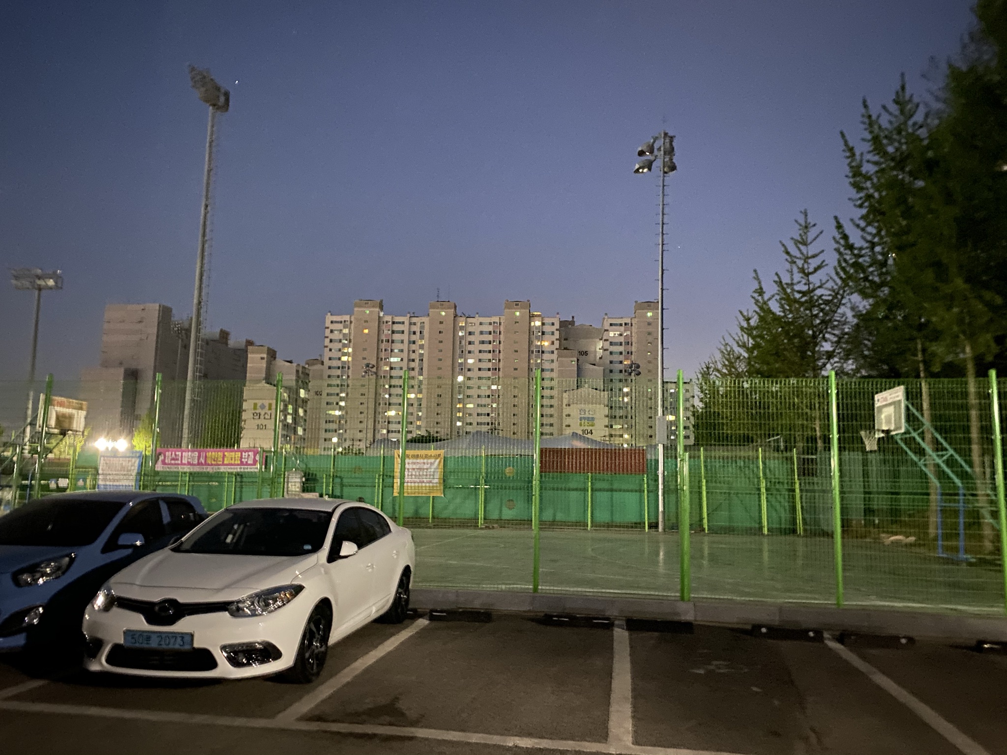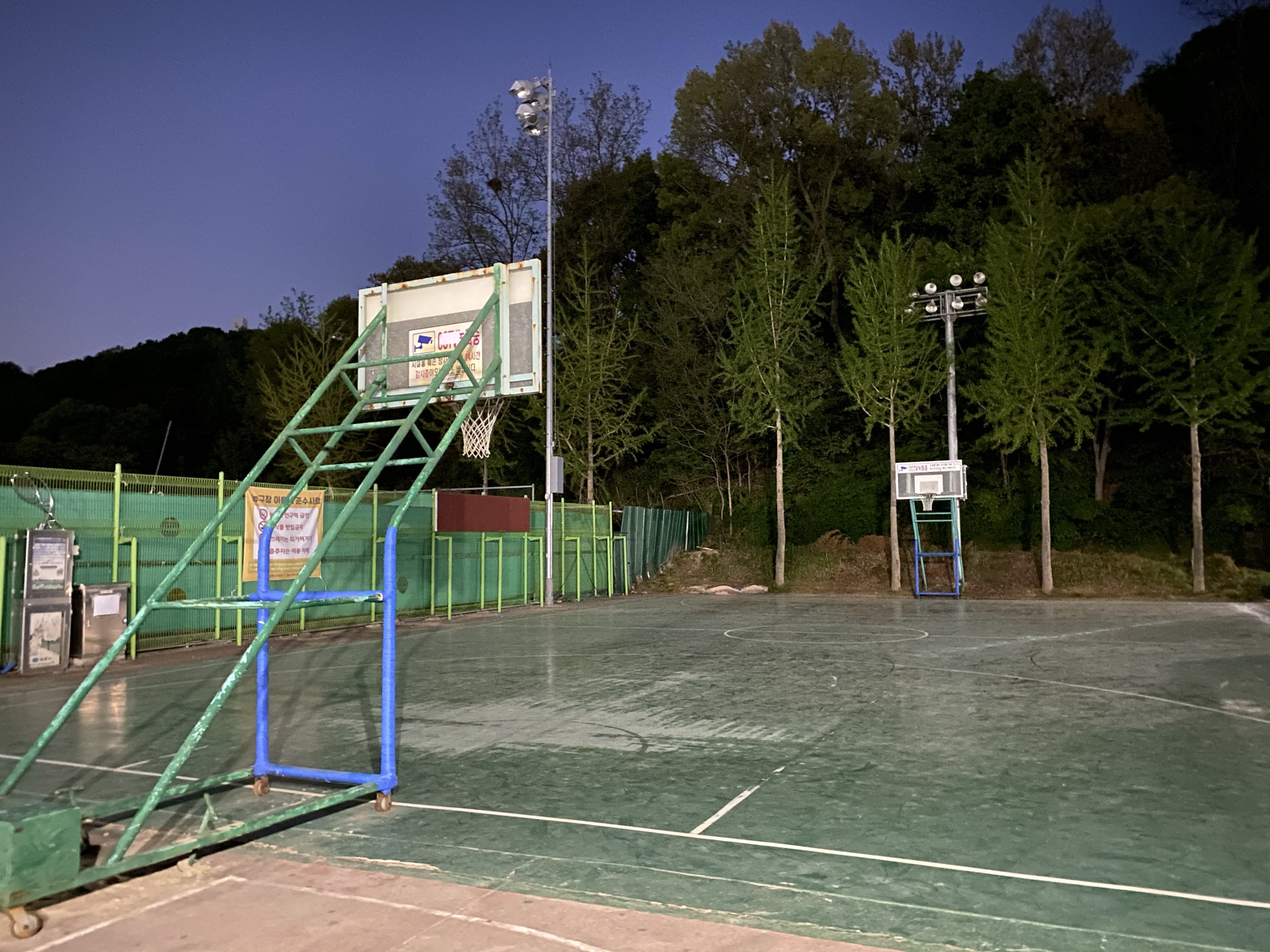 코로나로 인해 사용한 사람이 없어서 그런건지, 미세먼지나 황사 때문인지 바닥이 좀 더러웠다. 그래도 사용할 수는 있게 열려 있었다. (2021.05.09 방문 당시) 나름 우레탄 바닥의 풀코트다. 3점 라인이 서로 거의 맞닿아 있는 걸 보면 좁은 편이긴 하지만 반코트 2게임 돌리기엔 무리 없어 보인다. 공이 멀리 나가지 않도록 철조망으로 막혀 있다.