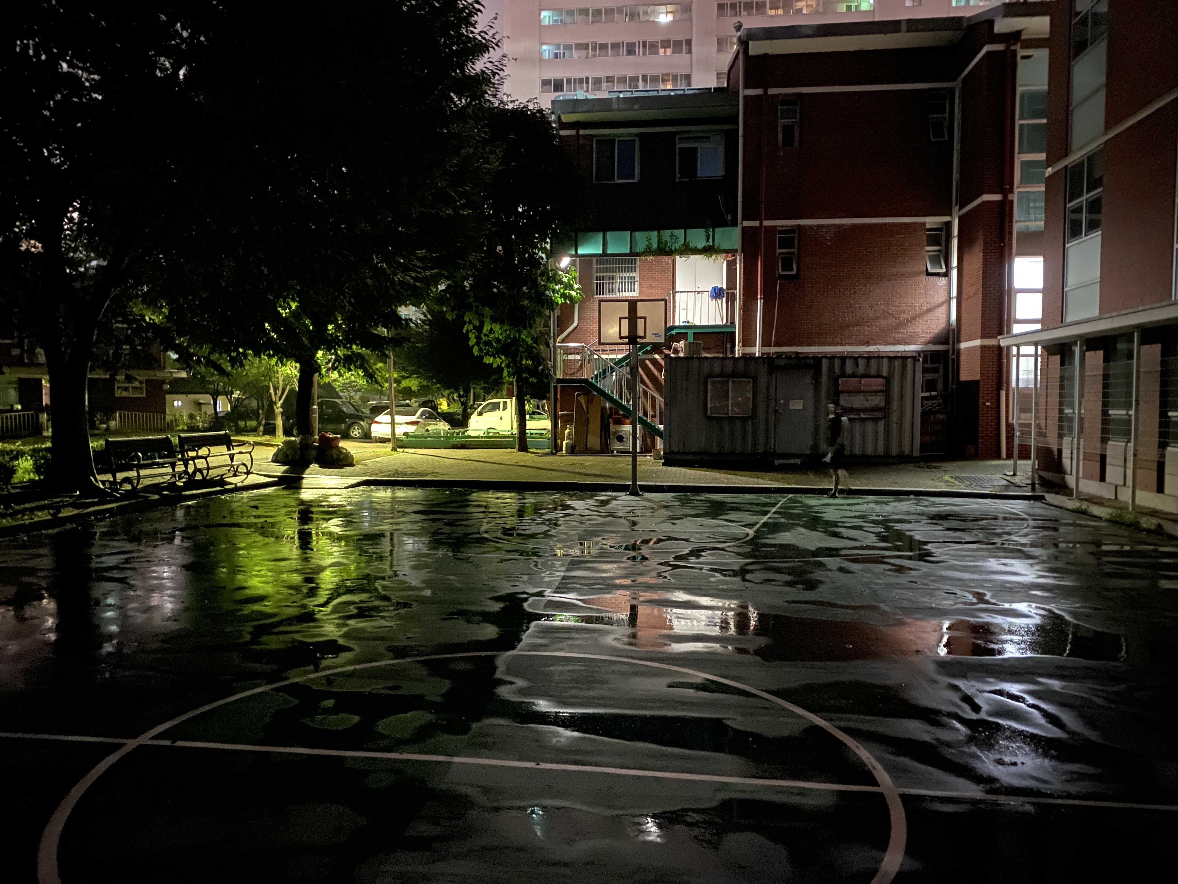 풀코트로 골대 2개라 반코트로 2게임 돌릴 수 있다. 다만 아쉬운 점이 있다면 여긴 잘 알려지지 않아서 사람이 없을 듯하다. 반코트 4:4 2게임 돌리려면 16명이 필요한데 올려나...ㅎㅎ....? 나중에 비 안 오는 날 낮에 와보면 알 수 있을 거 같다. 물론 4단계가 풀리고 이곳저곳 핫한 농구장이 열리면 여기도 인기는 없어지겠지만.