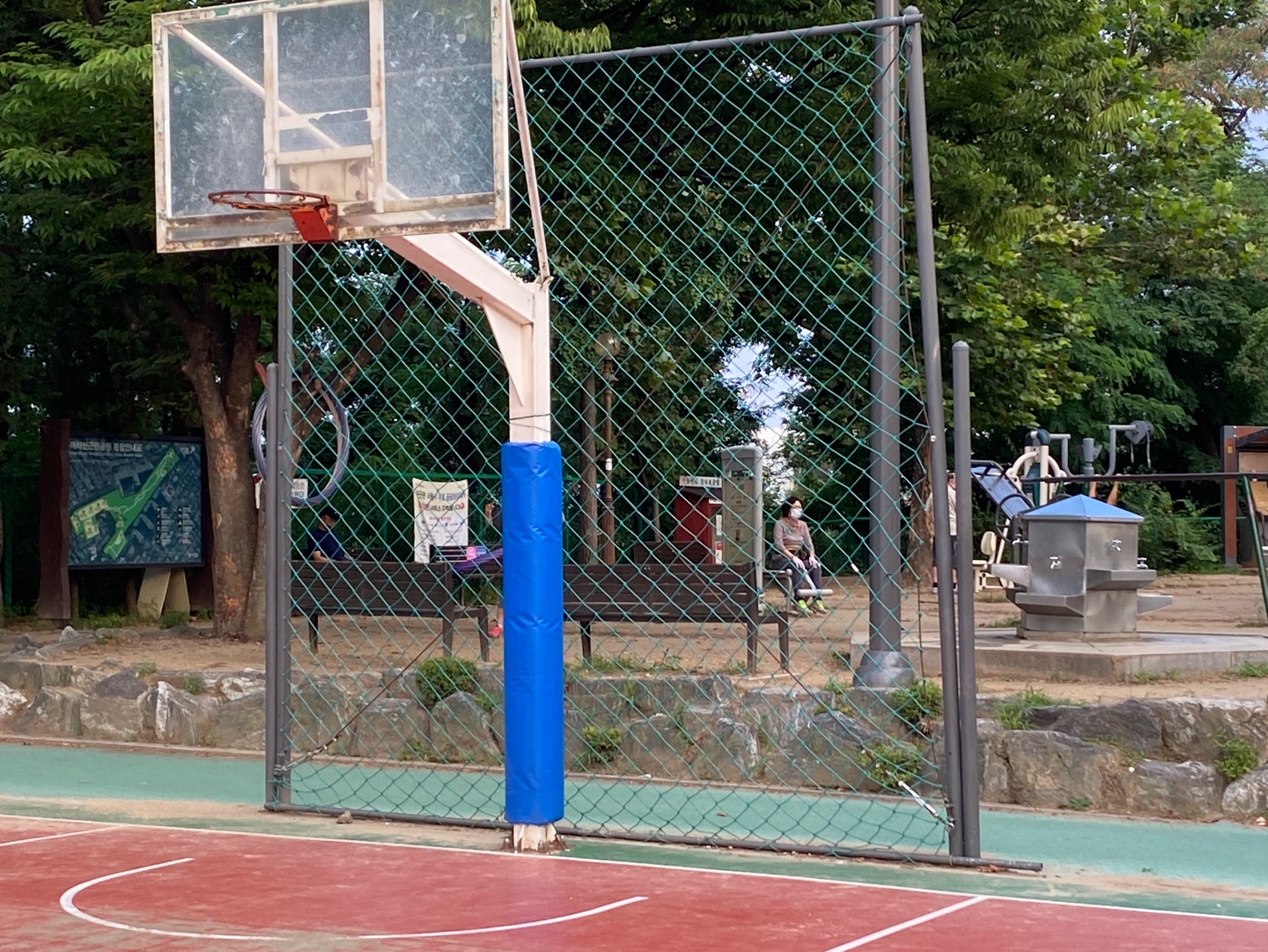 사실 처음에 갔을 때는 골대 사용 가능인 줄 알았다...ㅎㅎㅎ 이렇게 보면 그물만 없지 골대는 달려 있으니...ㅎㅎ 그런데 가까이서 보면 림을 철망 같은 걸로 막아놨다... 코로나 시기 때는 진짜 다시 상상하기도 싫네.. 진짜 ㅋㅋㅋ 농구할 곳 찾느라 혼났다...