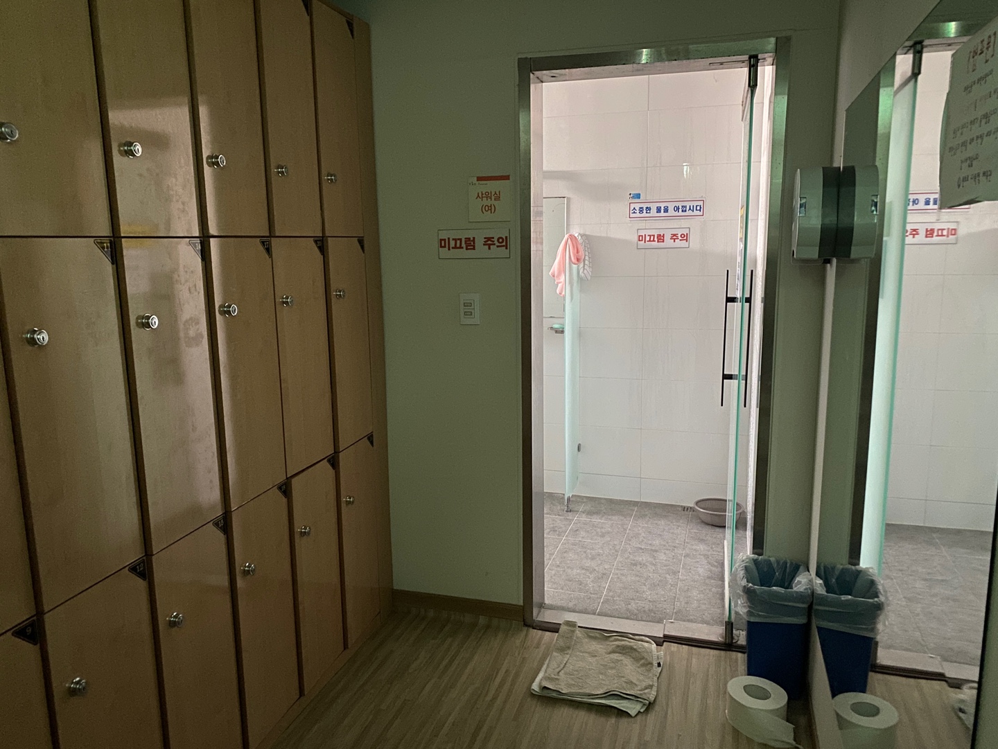 여자 탈의실, 화장실이 왼쪽에 있고, 남자 탈의실, 화장실이 오른쪽에 있다. 그리고 남자 탈의실 쪽에 정수기가 있다. 그래서 물 마실 때 좀 조심스럽다. 탈의실 커텐이 제대로 안 쳐져 있으면 괜히 민망할까봐 ㅠㅠ 일단 탈의실 내부에 사람이 없어서 내부 사진도 찍었다. 탈의실 안에 사물함이 있어서 안에 개인 짐 넣어 놓고 샤워하면 딱 좋다. 샤워기도 꽤 많았던 것으로 기억. 한 6개? 한 번에 6명이 씻을 수 있다는 장점도...아주 굿. (물론 난 아직 사용해 보진 못했음 ㅠㅠ 맨날 집 가서 씻음 ㅠㅠ) 화장실과 탈의실, 샤워실 모두 쾌적하고 깔끔하고 잘 정돈된 느낌이라 매우 좋다.