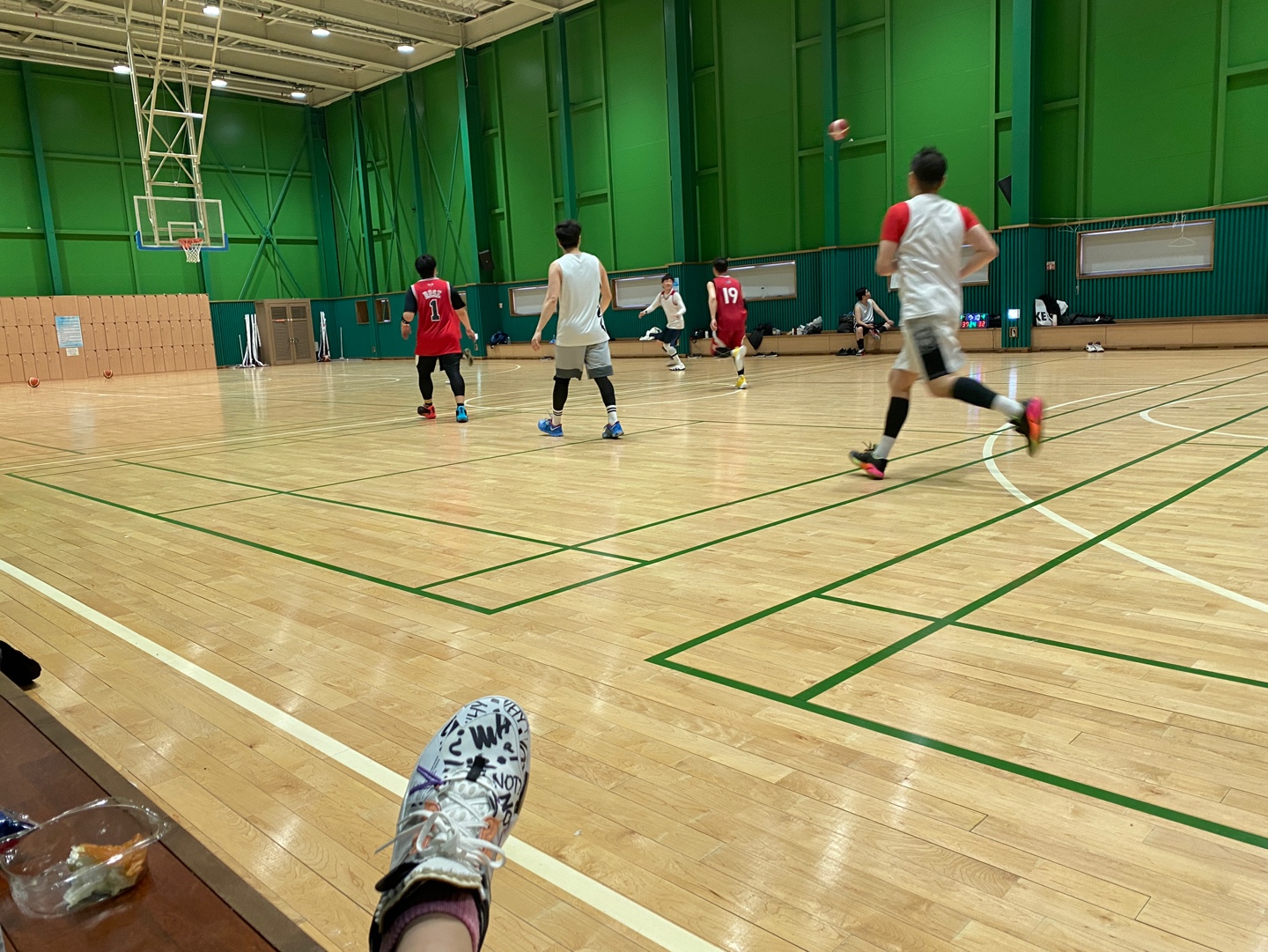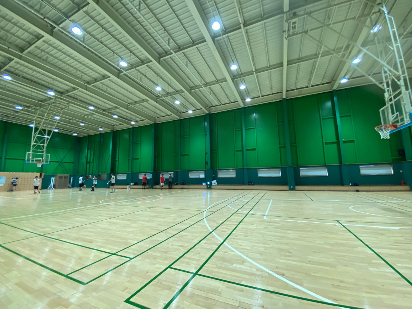 딱 풀코트 하나 있다. 이게 이 건물의 끝이다. 이렇게 체육관 하나 띡 있고 끝!! 배드민턴장이랑 농구장 두 종류로 쓰이는 것 같다. 우리 전 타임에는 배드민턴으로 쓰이는 듯...? 은근히 넓다. 완전 정규는 아닌 거 같지만 꽤나 넓어서 풀코트로 풀타임 뛰면 진짜 힘들어 죽을 거 같다...ㅎㅎㅎㅎ;; 일단 천고도 높아서 3점 슛 포물선 높아도 안 닿을 거 같구 매우 좋음!!! 보통 좀 작은 체육관은 천고가 여기 반만 해서 높이 쏘면 무조건 닿음...