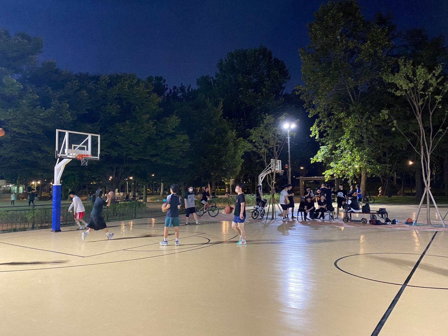 골대 그물은 천? 끈?이 아니고 쇠사슬 같은 걸로 되어 있어서 쉽게 끊어지지 않는 장점이 있긴 하다. 대신 그만큼 그물이 좀 쫀쫀하다고 해야 하나. 슛 쏘기 더 어려운 느낌. 벤치에도 바글바글 골 밑에도 바글바글. 그냥 바글바글. 사실 성인보다는 중고등학생이 훨씬 많은 느낌이다. 라이트는 10시까지 켜준다. 불을 켜준다는 것만으로도 고마워해야 할지도 모르지만....라이트가 조금 애매하게 밝아서 어두운 것도 같고 ...? (역시 반포짱! 반포는 아주 밝음! 잘 보임!)
