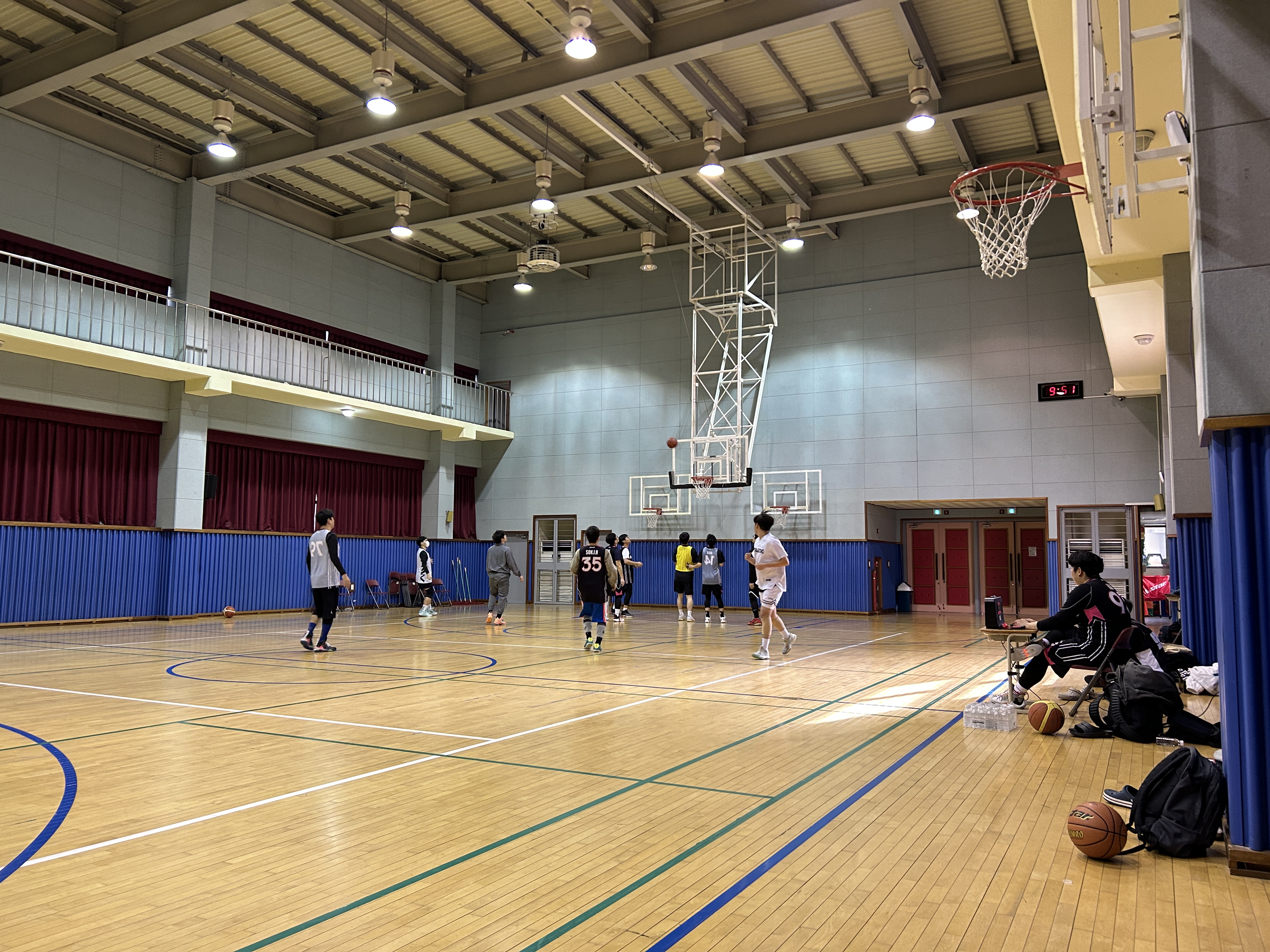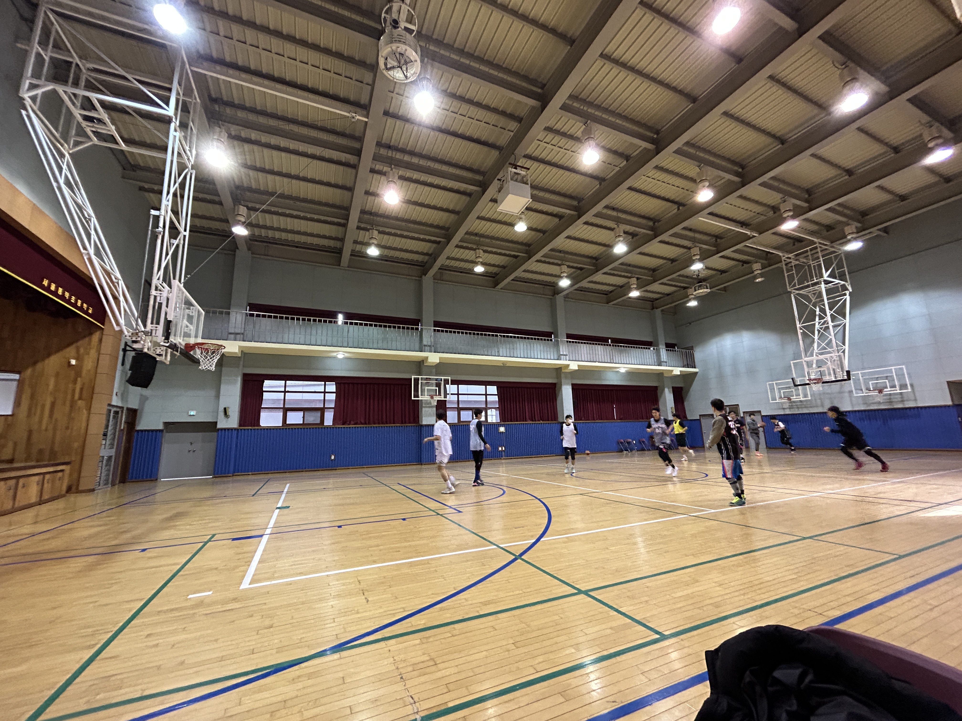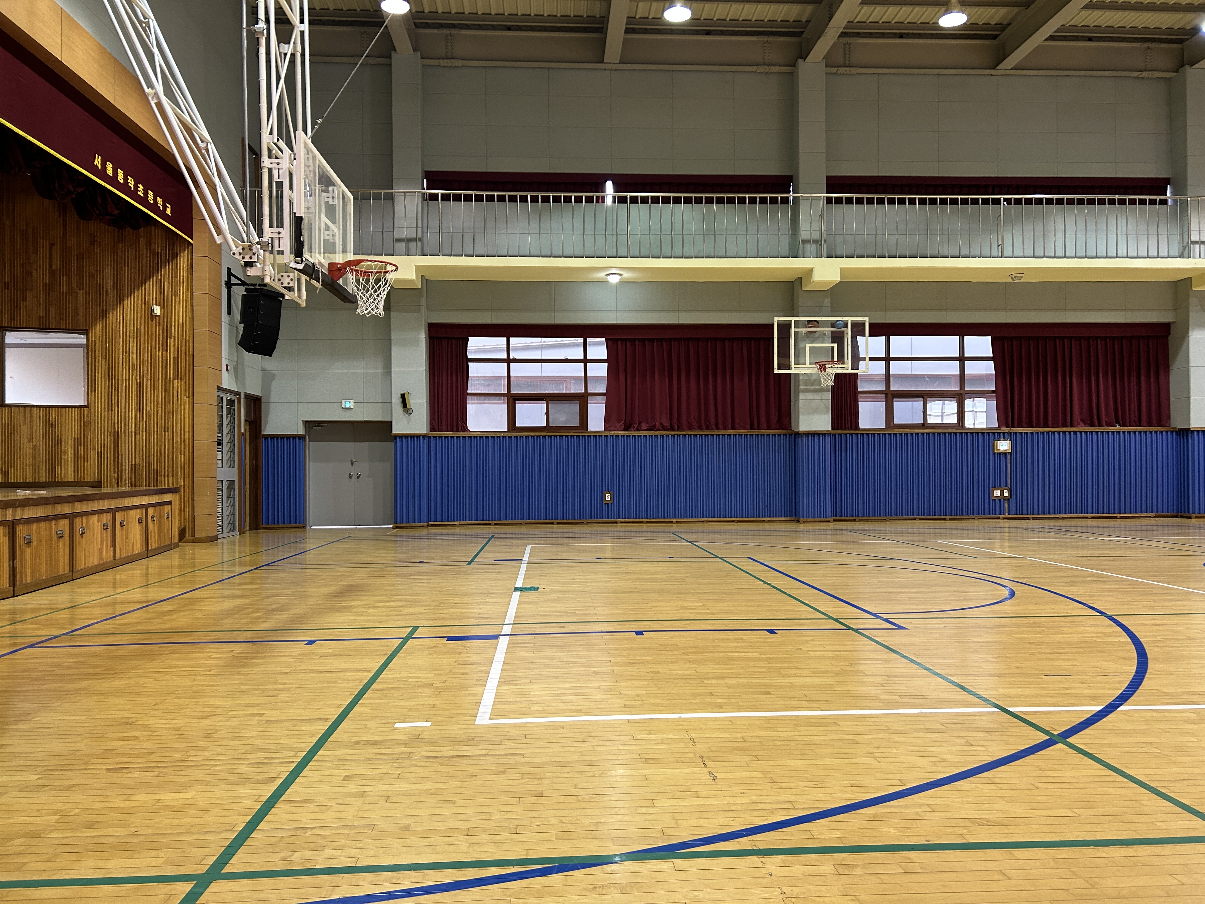 농구장이 확실히 ㅋㅋㅋ 엄청 작다... 초등학교 체육관이 원래 이렇게 작았나? 고등학교 체육관은 이것보다 크긴 했나? 별 생각이 다 들었던 농구장 사이즈 ㅋㅋㅋ 나름 강당 겸 체육관 겸 이래 저래 다용도로 사용하는 것 같은데 엄청 작았다.. 조금 뛰면 바로 하프 라인...ㅋㅋㅋㅋ 세로며 가로며 다 짧은 거 같다.. 골대도 좀 낮은 느낌..? 그리고 골대가 뭔가 정 위치에 있는 게 아니라 살짝 휜 느낌이었다.